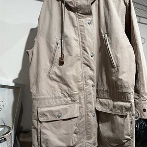 Chic and practical utility jacket with a hood. Features multiple pockets and a button-up front.