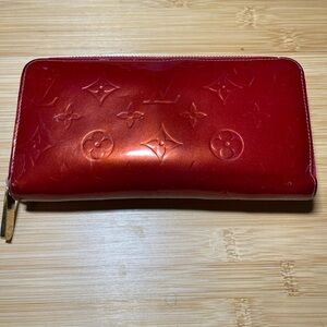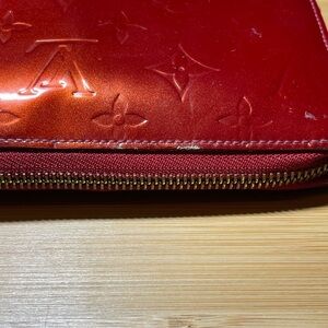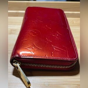 Made from Vernis leather, which is known for its glossy, patent finish in Cerise red.