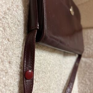 Vintage burgundy leather handbag is a Russell & Bromley clutch featuring gold hardware and a branded interior label with adjustable magnetic clasp and interior zipper pocket and suede like lining. This elegant purse is perfect for any occasion. Its sleek design and durable material make it a must-have accessory.