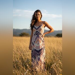 Chic maxi dress with geometric patterns. Features a blend of colors for a stylish look. Ideal for any occasion. Very flowy and comfortable! It looks super flattering on. Size 6.