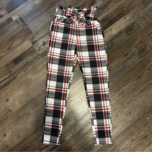 Stylish plaid high-waisted pants featuring a bow tie. Perfect for a chic look.