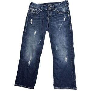 Very nice pair of Silver Jeans Capri. Size 28 Suki Flap Capri. They are distressed and have the flap pockets. Waist measures 15" across laying flat, rise is 8.5" and the inseam is 21.5"