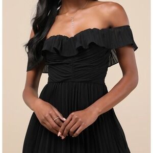 Command attention in this stunning Lulus black off-the-shoulder maxi dress. The exquisite ruffle neckline cascades into a ruched bodice, while the tiered pleated skirt creates a dramatic and flowing silhouette. This gown is perfect for making a memorable entrance at galas, weddings, or sophisticated celebrations.