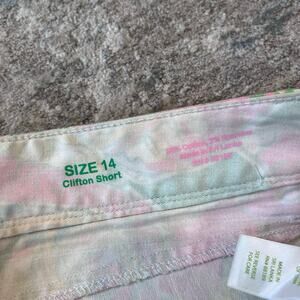 Lilly Pulitzer Women's Clifton Short Multi Chin Chin. Women's size 14. Printed denim shorts in fun green and pink paisley print with elephants and monkeys. Cuffed hem. Mid-rise. 98% cotton, 2% spandex. Retail $108. Great condition with no flaws noted!