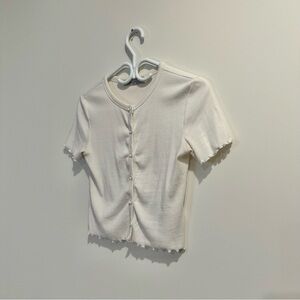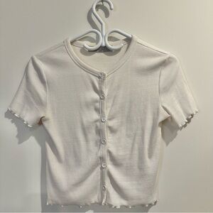 Stylish white button-up top with short sleeves. Perfect for casual wear.