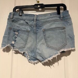 • Details: Frayed hem, ripped detailing on front, and exposed pocket lining.