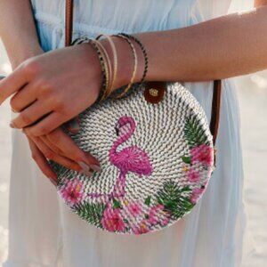 Handmade White Round Shape Rattan Crossbody Bag with Flamingo Printed Motif