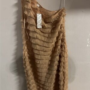 Chic asymmetrical dress with layered ruffles. Soft cream color. Ideal for stylish outings.