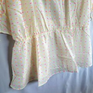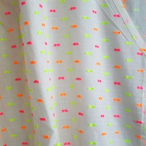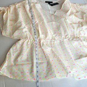 Chic white blouse with bright pink, yellow and orange accents. Features a V-neck and ruched sleeves. Perfect for casual, beach, vacation, swimwear.. Brand new with tags, Reposhing because unfortunately didn’t fit.