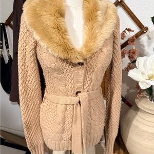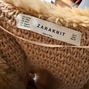 Zara knit Women's Tan Cable Knit Sweater with Faux Fur Collar