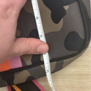 Stylish camouflage crossbody bag featuring a vibrant pink and orange strap. Perfect for everyday use. Neoprene material is easy to keep clean and is wipeable. Front pocket and zipper closure.