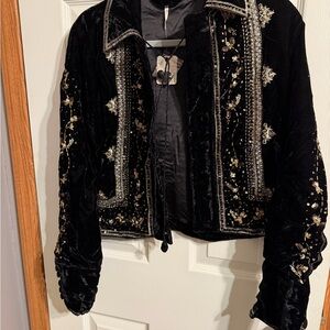 Chic black blazer with detailed embroidery. Ideal for stylish layering.
