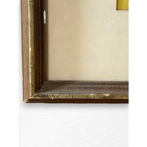 The piece likely dates to the late 1950s or early 1960s, which is consistent with the family history of over 60 years and the style of the framing label from Mac Arts Co. in Redondo Beach, California. The print is housed in its original vintage gold-toned wooden frame with a vibrant yellow inner matte that highlights the floral subject. It is in excellent vintage condition, showing only minor wear to the frame consistent with its age.