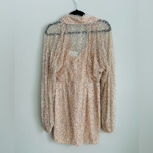 Stunning Mac Duggal champagne beaded mini dress — brand new with tags. This fully embellished cocktail dress features intricate allover beading, a flattering deep V neckline, long blouson sleeves, and a fitted silhouette that sparkles from every angle.