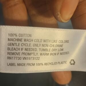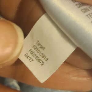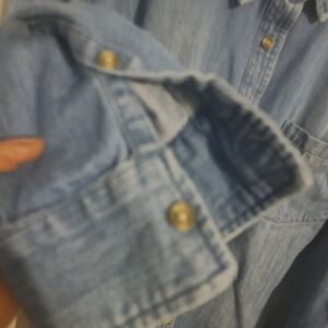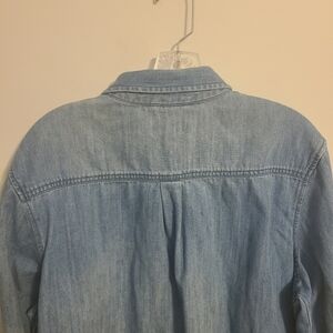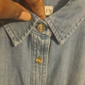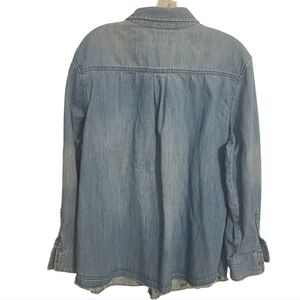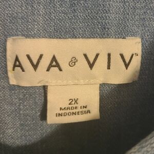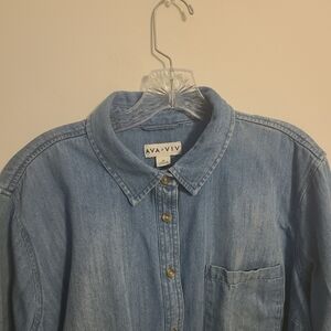 Women's long sleeve, button-down denim shirt by Ava & Viv, size 2X. Shirt has a breast pocket, buttons on sleeve and a raw, distressed hem. Fabric is 100% cotton. Excellent pre-owned condition; no flaws.