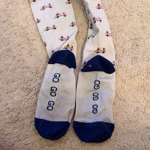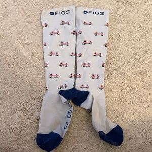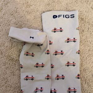 Compression socks by Figs. Cream base with navy accents. Features ambulance pattern. Ideal for casual wear.