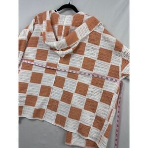 Torrid crochet cardigan features a bold checkered pattern in peach and white, offering a relaxed and breezy aesthetic. Crafted from a lightweight 100% acrylic knit, this open-front layer includes a cozy hood and wide drop-shoulder sleeves for a comfortable, oversized fit. The airy open-stitch construction makes it a perfect transitional piece for layering over tanks or dresses.