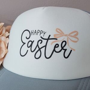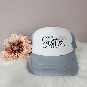 Celebrate Easter with this stylish trucker hat. Features 'Happy Easter' text with ribbon bow on the front. White front panel with gray mesh back. NEW!