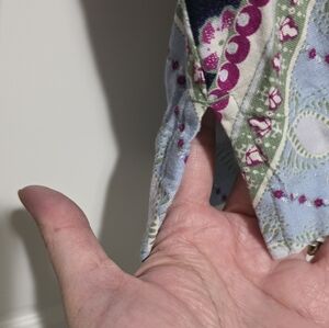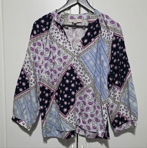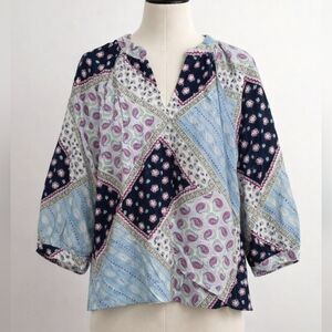 LOFT Paisley Boho Floral Patchwork Linen Blend Peasant Blouse 3/4 Raglan Sleeve
