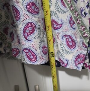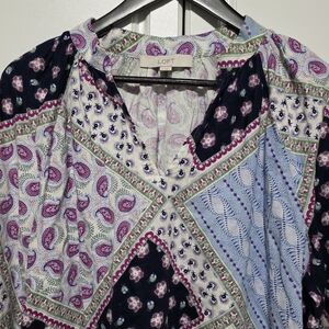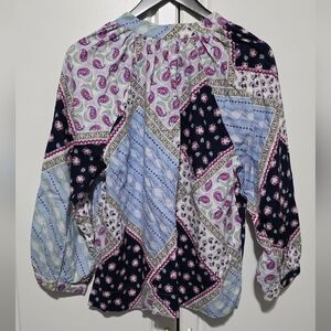 LOFT womens paisley boho floral patchwork linen blend peasant blouse split neck blouson size medium with a touch of globetrotter chic, split neck with standing collar, 3/4 raglan sleeves with button cuffs.