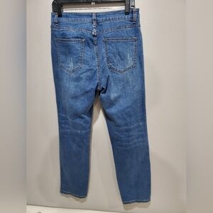 Trendy blue jeans with stylish distressed details. Features sparkling silver sequin pockets Perfect for a fashionable casual look.