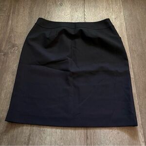 Item Description: Women's Ann Taylor skirt, navy blue, size 8, side zipper closure with hook, faux button detail at front, side pockets, lined, no stretch, above knee fit.
