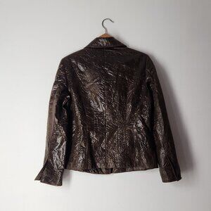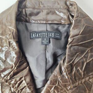 Lafayette 148 New York brown crinkle-texture blazer. Three button closure, "croco" or "crinkle wrinkle" texture, made from 100% acetate to achieve its unique faux-leather appearance, fully lined.