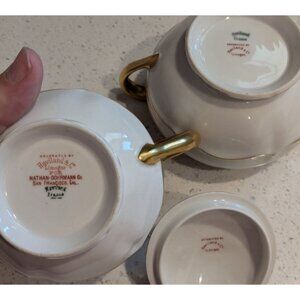 Sugar bowl lid has a repaired crack across it and handle was also repaired. Creamer marked Haviland & Co, Limoges FOR Nathan-Dohrmann Co. San Francisco, Cal.