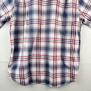 This Vintage Polo Sport Ralph Lauren Red Blue Plaid Linen Blend Camp Shirt in size XL is a stylish and classic addition to any man's wardrobe. Made from a comfortable linen blend fabric, this shirt features a collared neckline, short sleeves, and a relaxed fit for a casual yet put-together look. The red and blue plaid pattern adds a touch of sporty flair, while the button-up closure and multicolor exterior make it a versatile piece for various occasions. Perfect for those who appreciate vintage style and quality craftsmanship.