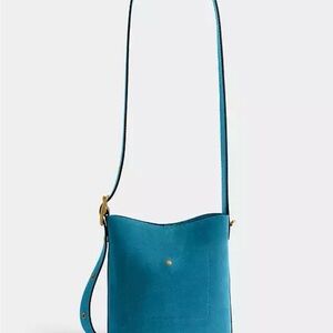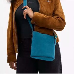 Stylish Coach crossbody bag with matching pouch. Elegant teal color. Perfect for daily use.