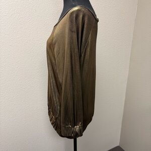 Gorgeous Rachel Roy metallic gold blouse in size Large featuring a stunning shimmer finish, relaxed dolman sleeves, scoop neckline, and flattering banded hem. Soft, fluid fabric drapes beautifully for a chic, elevated look with subtle stretch and comfort.