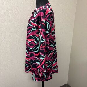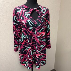 Southern Stitch statement top in size Large featuring a bold black, pink, and mint abstract print with flattering front keyhole neckline detail. Soft, stretchy fabric (95% polyester, 5% spandex) offers comfort with a polished silhouette. Three-quarter sleeves and flowy fit make it easy to dress up or down.