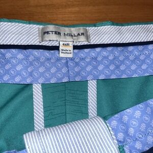 These Peter Millar golf shorts in size 46R are a stylish and comfortable option for various occasions. The shorts feature a zip closure, flat front, and are made from a blend of polyester and spandex for a lightweight feel. The aqua color with an abstract fishing design adds a fun and nautical touch, perfect for beach trips or casual outings. With a 10-inch inseam and pockets, these shorts are practical and versatile for those who enjoy outdoor activities.