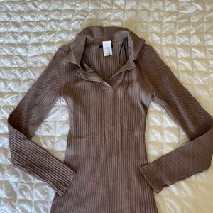 Embrace a chic and comfortable look with this Love Tree dress, featuring a ribbed texture and a bodycon fit. The long sleeves and polo collar add a touch of sophistication, making it perfect for casual or work settings. Perfect Capsule Wardrobe Staple