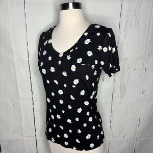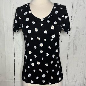 Stylish black tee with white daisy pattern. Short sleeves. Ideal for everyday wear.