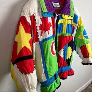 Collector Appeal: Rare 90s Neiman Marcus Gallery ski jacket, featuring Olympics-inspired prints from Canada, Brazil, and Sweden — a highly collectible unisex vintage piece for both men’s and women’s wardrobes.