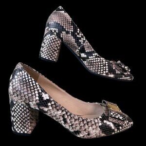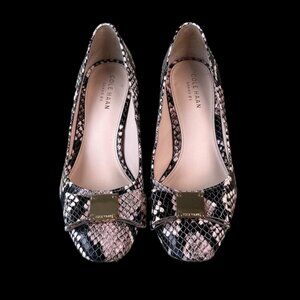 Elegant Cole Haan Tali Bow pumps in a stylish Roccia snake print. Features a classic round toe, block heel, and signature bow detail with hardware accent. Comfortable and versatile for work or dressy occasions.