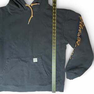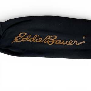 Men’s Eddie Bauer Workwear pullover hoodie in navy with tan hood lining and drawstrings. Features front kangaroo pocket and large Eddie Bauer script logo down sleeve. Heavyweight feel – great for workwear or casual wear.