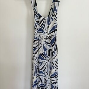 Stylish maxi dress with bold blue and white pattern. Sleeveless design. Perfect for summer outings.