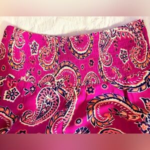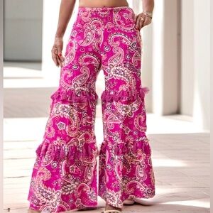 Discover Women's Tiered Wide Leg Paisley Trousers, a perfect blend of bohemian charm and contemporary style. Crafted from 100% viscose, these pants feature a tiered design with a smocked waist, offering both comfort and an eye-catching silhouette. Ideal for festival season or relaxed day, these pants are a must-have for anyone aiming aiming for style and comfort.