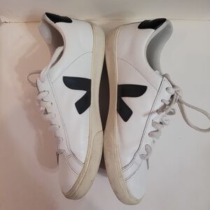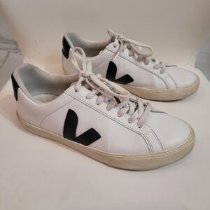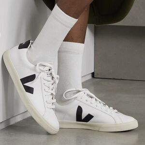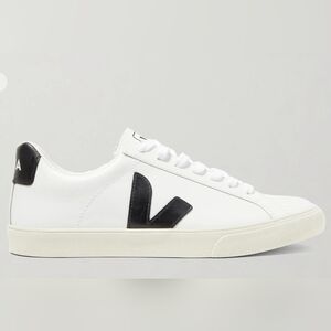 Veja works closely with local farmers and factories to ensure its sneakers are responsibly made from start to finish. This 'Esplar' pair is made from white leather with contrasting black heel tabs and 'V' appliqués on each side. The soles are created using wild rubber sourced from the Amazon rainforest. Wear them with anything from jeans to midi dresses. Stylish white sneakers with black accents. Classic lace-up design. Comfortable and versatile.
