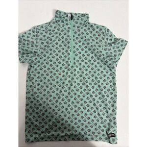 The Kerrits Ice Fil Women's green m 1/4 Zip Equestrian Print Short Sleeve Riding Shirt is a high-quality and stylish top designed specifically for female equestrians. Made by the reputable brand Kerrits, this shirt offers both comfort and functionality. The 1/4 zip design allows for easy layering while the equestrian print adds a fun and unique touch. With its short sleeves and breathable material, this shirt is perfect for wearing during rides or outdoor activities. A 14