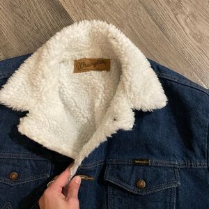 Vintage 80s Wrangler Dark Blue Denim Jacket with White Sherpa Lining