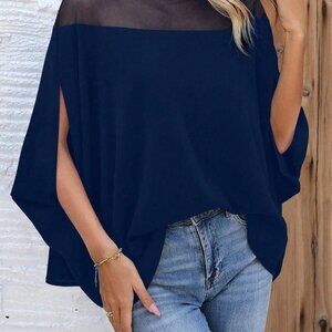 Make a bold statement with this high collar, loose-fit blouse featuring eye‑catching mesh patchwork and sheer fabric. The dramatic slit and flowing batwing sleeves add effortless elegance, while the relaxed silhouette ensures comfort all day. Perfect for fashion‑forward wardrobes, this versatile blouse pairs beautifully with jeans, skirts, or tailored pants for a chic, on‑trend look.