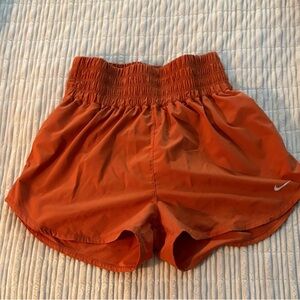 Bright orange Nike shorts. Ideal for sports and leisure. Elastic waistband for comfort.