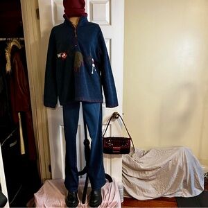 Vintage Faded Glory yarn fleece. Zip up neck and long sleeves. Designed with yarn stitching throughout. Upper neck yarn trim is loose. See photo. Navy blue and burgundy color combo. Please note that measurements are not exact due to manual listing. Please see attached photos for details and any flaws. Thanks for stopping by🥰
