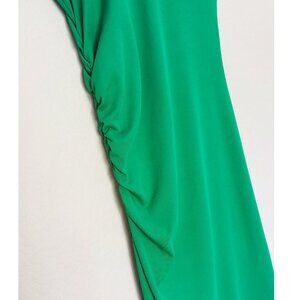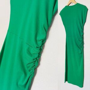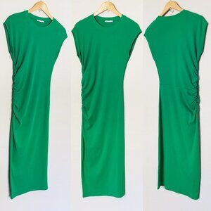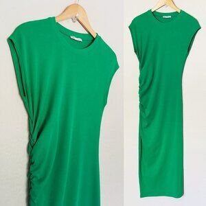 Zara Ribbed Knit Crew Neck Ruched Gathered Midi Dress L Cap Sleeves Kelly Green
