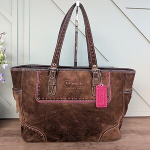 Elevate your style with this Coach brown suede tote bag, featuring chic pink accents. Perfect for any occasion, this bag combines luxury and functionality.