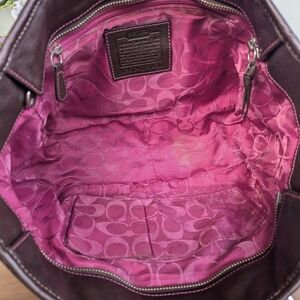 vintage Coach Hampton Gallery Suede Tote in chocolate brown. This specific model is noted for its chocolate brown suede exterior and contrasting hot pink leather trim and piping. Key Features