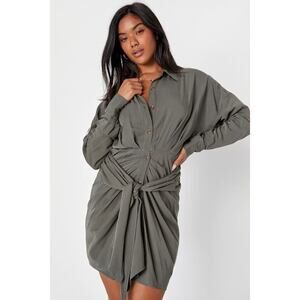 Add a little shine to your everyday 'fits (and feel good about it!) in the Lulus Charming Confidence Olive Green Collared Button-Up Mini Dress! Midweight woven fabric shapes long sleeves with button cuffs that frame a blousy, gathered bodice with a collar
